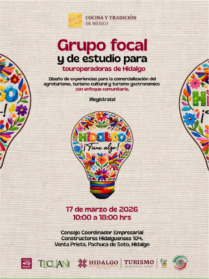 Con el objetivo de fortalecer la comercialización de experiencias turísticas con enfoque comunitario, el programa Cocina y Tradición de México, en coordinación con la Secretaría de Turismo del Estado de Hidalgo, convoca a touroperadoras del estado a participar en el Grupo Focal y de Estudio para el diseño de experiencias de agroturismo, turismo cultural y turismo gastronómico.